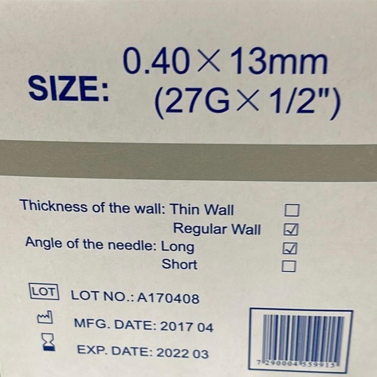 מחט סטרילית 27G*0.5 0.4*13אפור 100 יח' KDL